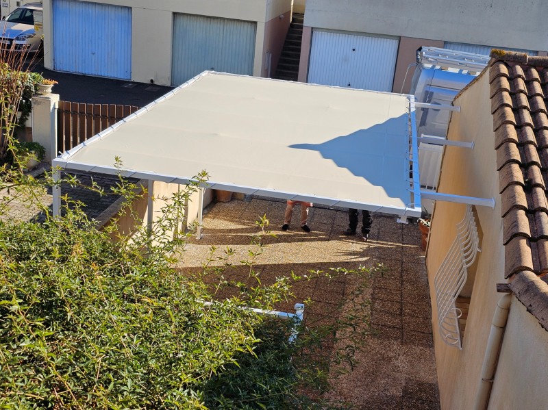 Nous avons ensuite fixé un toile microperforée sur mesures de couleur champagne, de la marque Serge Ferrari Soltis. Ces toiles de très grande qualité, procure un ombrage parfait, bloquant 100% des UV tous en laissant passer de l'air. Elle sont garanties 5 ans et proposées en différents coloris.