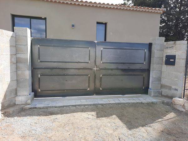Pour la réalisation de ce portail coulissant plein en acier de 3m50 x 1m60 sur la commune de Saint Cannat , notre cliente désirait un portail assez moderne, tout en gardant un style métal et fer forgé.