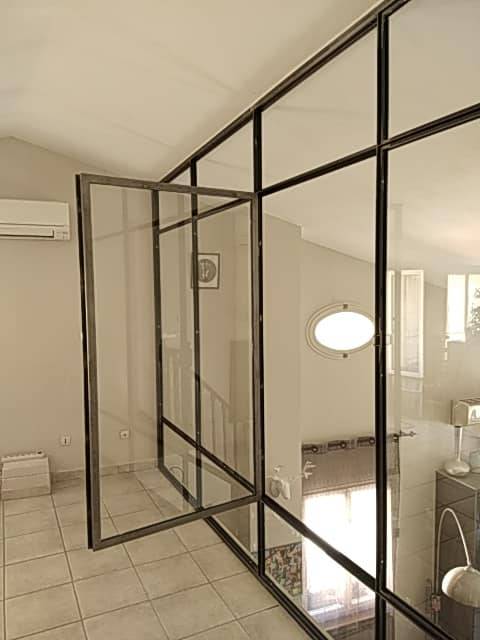 Pour cette réalisation, notre client désirait une verrière de style industriel, épurée, dotée d une porte et d une fenêtre.